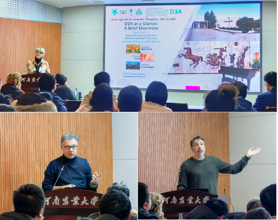 四位意大利专家分别围绕马尔凯理工大学的教学体系、学科建设、人才培养及前沿研究方向作了专题报告。Marina Pasquini副教授系统介绍了D3A的学科设置、本科与研究生教育体系、实验农场与科研平台,以及国际化合作项目,展现了其跨学科融合与创新教育的特色。Michele Cianci教授则聚焦于生物化学实验室的研究方向,重点阐释了其在酶学、维生素B3代谢与疾病调控、食品成分分析等方面的前沿成果。Paolo Lucci副教授共同介绍了食品化学与技术研究组,围绕食品活性成分鉴定、污染物检测、食品真实性鉴别、功能食品开发及新型食品加工技术等方向,展示了多项具有应用潜力的研究成果。报告内容详实、视野开阔,引发了在场师生的浓厚兴趣。在互动环节,师生们踊跃提问,就食品营养与安全、生物活性物质开发、中意食品科技合作前景等议题与专家们进行了深入交流。