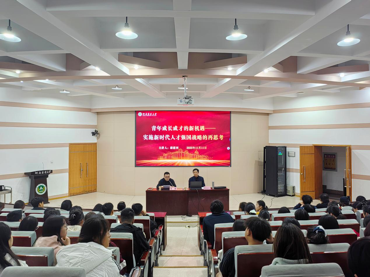 于文化路校区300人报告厅成功举办题为“青年成长成才的新机遇——实施新时代人才强国战略的再思考”的主题讲座。校关工委委员康建利教授作为主讲人,25级全体学生参加本次会议,会议由博士辅导员银锋主持。