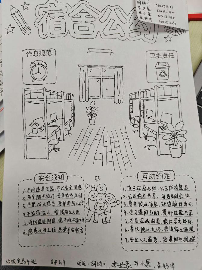 这些由同学们亲手创作的宿舍公约,早已超越简单的规章条文。它们源自真实的生活体验:有人将物品收纳的心得化为清晰指引,有人把作息、安全和卫生细节巧妙绘入画面。实用与创意在此交融,规矩与温情彼此呼应。这些用心写就、用情画下的约定,不仅守护着寝室的秩序,更承载着同窗之间的理解与牵挂。