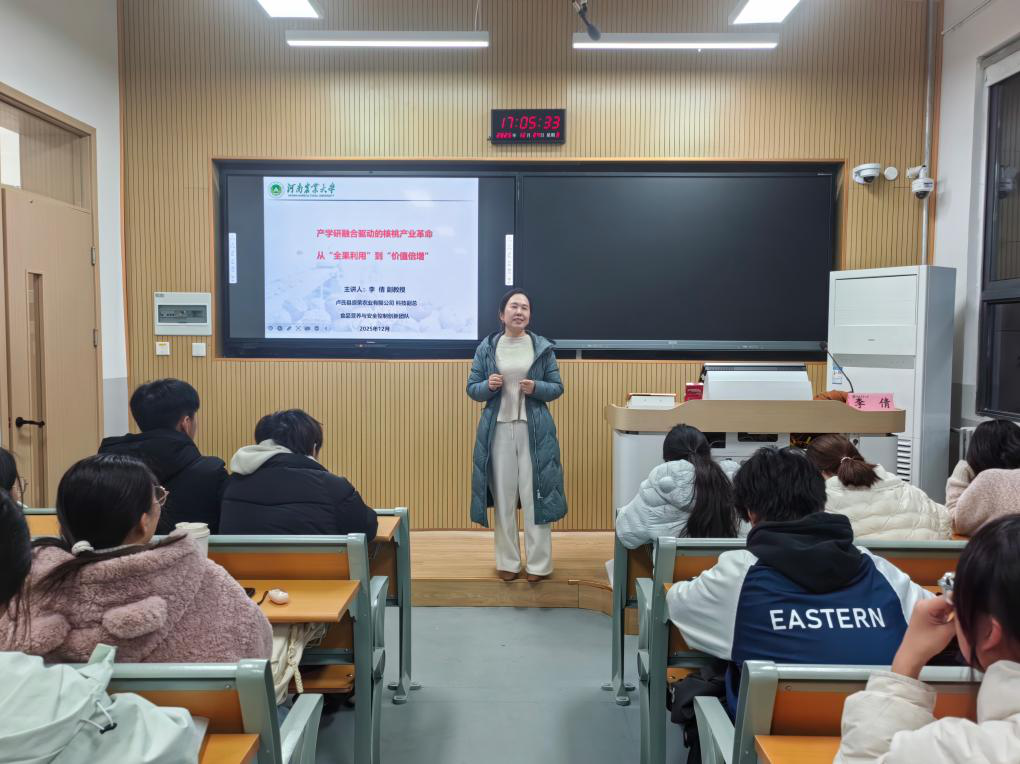“未来领航员”计划第八期行业前沿讲座于12月24日在文化路校区三号楼顺利举办。学院食品营养与安全控制创新团队核心成员、卢氏县原荣农业有限公司科技副总李倩副教授以《产学研融合驱动的核桃产业革命——从“全果利用”到“价值倍增”》为题,为全体新生带来了一场聚焦核桃产业高值化、兼具实践深度与应用价值的专题分享。
