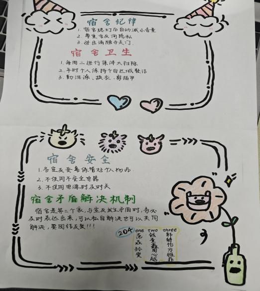 同学们以巧思为笔、以创意为墨,将标准化的住宿规范转化为形式多元的宿舍公约作品。他们或用手绘插画搭配诗意文字,将卫生值日、作息管理等细则具象化;或结合宿舍生活的真实体验,增设安全贴士、矛盾调解等实用条款,让冰冷的规章条文变得鲜活温暖。这些作品既融合了实用性与创意性,也让规矩与温情相互交织,突破了传统制度的刻板框架,承载着室友之间的理解与牵挂,更成为同学们对宿舍这一“第二个家”真诚守护与美好期许的具象表达。
