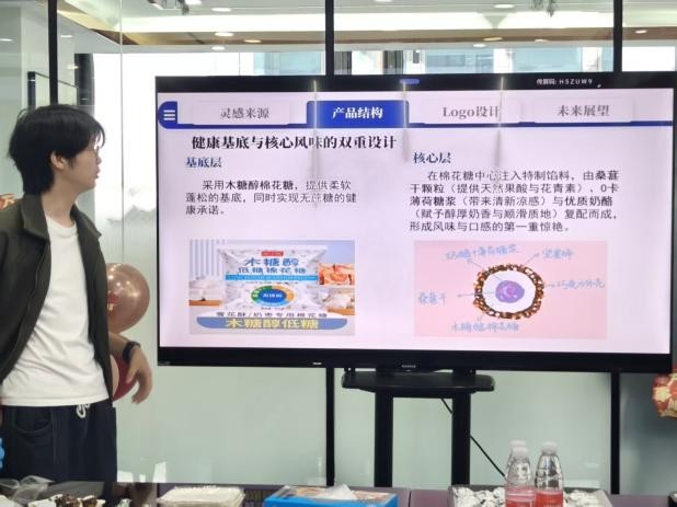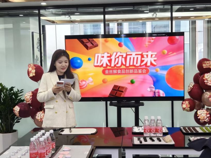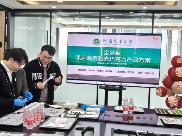 活动现场,各参赛团队携创意产品亮相,从配方创新到口感调试,充分展现了扎实的专业功底与丰富的创新巧思。金丝猴企业负责人亲临现场,对作品进行细致点评,从市场需求、工艺优化等角度提出专业建议,为同学们的创意落地提供了宝贵思路。同时,企业带来新品巧克力供大家品鉴,让同学们近距离感受行业前沿风味与研发理念,现场气氛热烈。