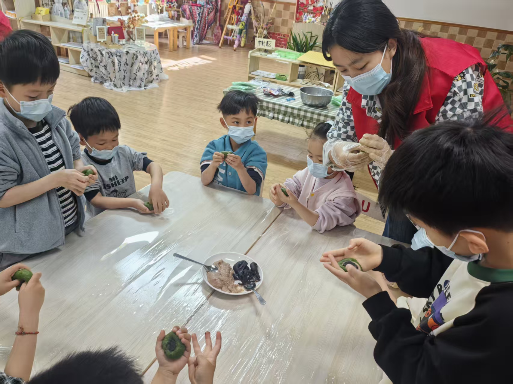 活动现场,志愿者们将青团食材知识与幼儿食品安全科普有机结合,以寓教于乐的形式,通过趣味互动、场景化讲解,向孩子们传递饮食卫生、食材辨别、科学膳食等基础常识,引导幼儿树立健康饮食观念。随后,在规范的卫生保障下,志愿者手把手指导孩子们揉面、包馅、塑形,制作豆沙、芋泥、蛋黄肉松三种口味的青团,让孩子们在动手实践中感受传统美食魅力,掌握食品制作的卫生规范要点。